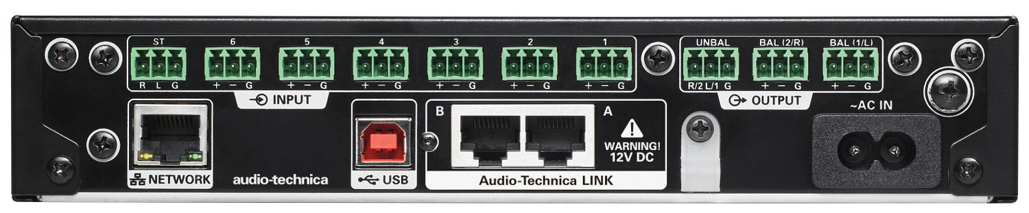 Микшер оснащен четырьмя сбалансированными микрофонными входами, двумя симметричными входами Mic / Line и одним несбалансированным стереофоническим входом, а также двумя сбалансированными и двумя несбалансированными выходами. В комплект поставки также входят сеть (Cat 5e или выше) и USB-порты, а также порты A / B Audio-Technica Link, которые позволяют пользователям подключать шесть микшеров ATDM-0604 через кабель Cat5e для одновременного использования в расширенной настройке.