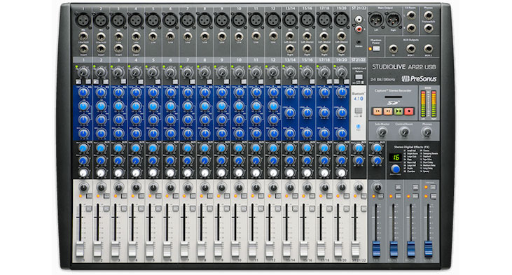 В StudioLive AR22 USB предусмотрены микрофонные предусилители класса A и 26 аналоговых линейных входа. Микешнр оснащен 60-миллиметровыми фейдерами. Каждый из 12 моноканалов и 4 стереоканала имеет низкочастотный фильтр, mute, панорамирование и соло с прослушиванием prefader. Так же имеется фантомное питание для использования с конденсаторными микрофонами.