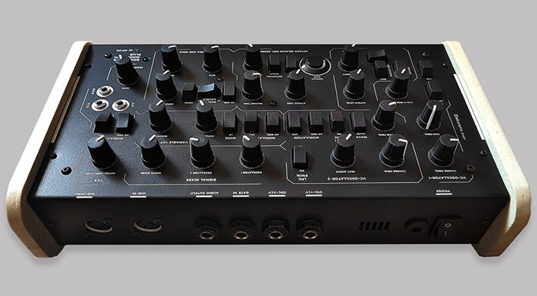 Для соединений вы получаете 2 входа CV и вход gate, моно аудио выход и выход для наушников. На стороне MIDI есть MIDI-вход и MIDI THRU который очень полезен при интеграции с другими MIDI-устройствами. Корпус имеет деревянные боковые панели.
