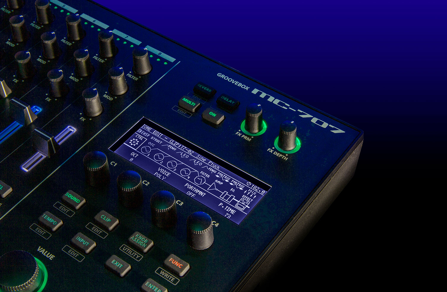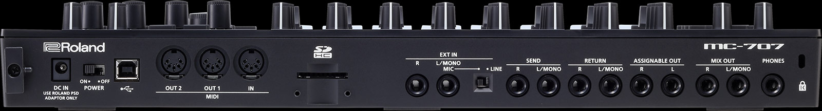 Восьмитрековый секвенсор MC-707 ориентирован на гибкое производство музыкальной продукции в современных электронно-ориентированных стилях, которые находятся в состоянии перманентной трансформации. Шаговый секвенсор TR-REC, такой же, что и в классических драм-машинах компании Roland, идеально подходит для оперативного создания ритмических партий. Имеется также 16 ультрачувствительных пэдов для исполнения или секвенсирования партий ударных, мелодических басовых линий или прогрессий полифонических аккордов. С помощью клипов секвенсора можно записывать не только нотные данные, но и данные, генерируемые при манипуляциях с регуляторами. Это позволяет создавать драматические динамично меняющиеся эффекты, такие как глубокая реверберация от одного хлопка, постепенное изменение параметров фильтра и многие другие.