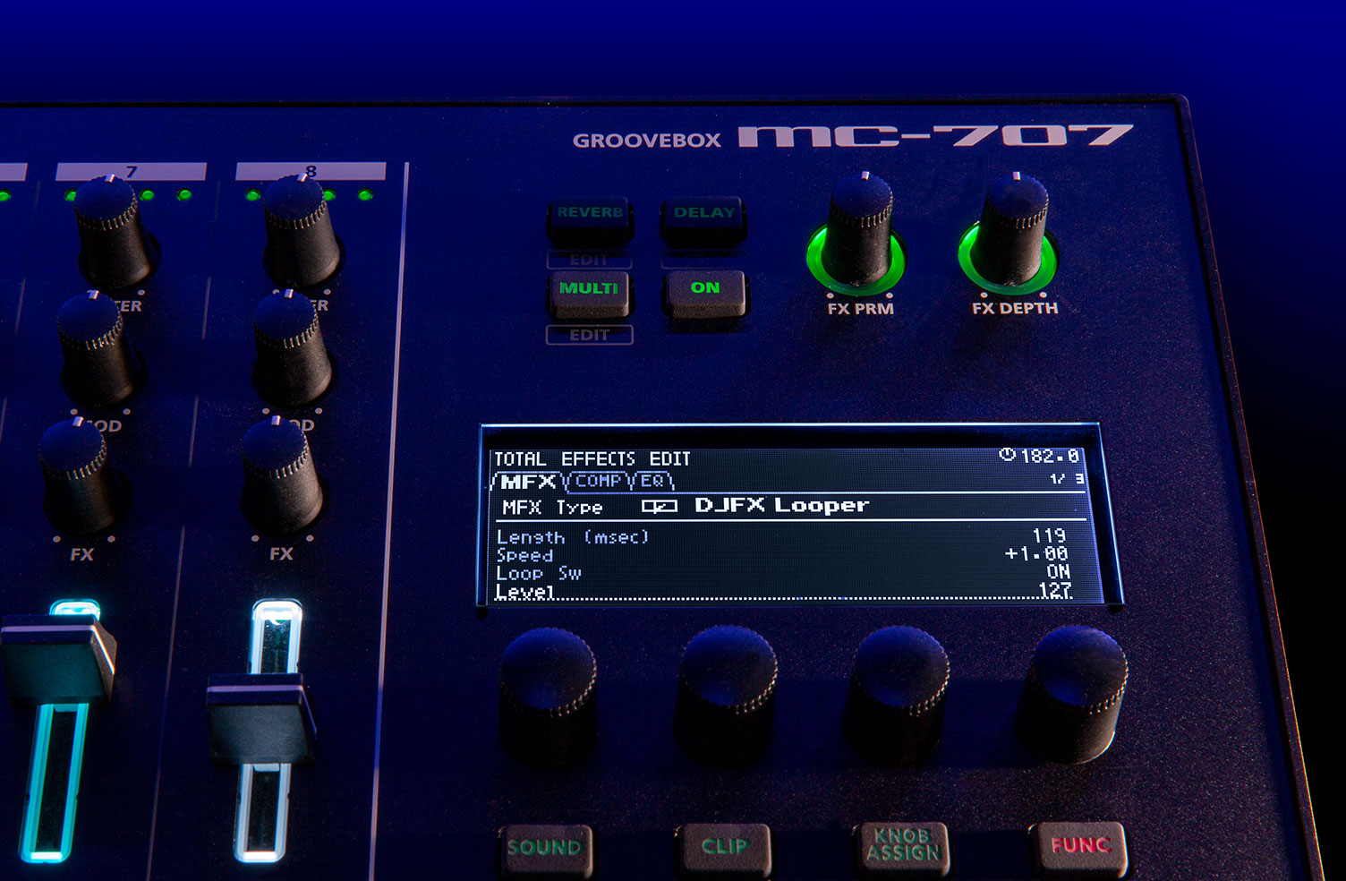 Великое множество разнообразных эффектов МС-707 позволяют выдавать "на-гора" качественный готовый продукт. Каждый из восьми треков можно обработать собственным процессором эффектов, предусматривающим огромное количество вариаций. С помощью роскошного хоруса можно добавить глубины в звучание подкладов и других синтезаторных тембров. А с помощью задержки и ревербератора — добиваться пространственного изменяющегося во времени звука для изысканных секвенций. Овердрайв, дисторшн и имитация усиления добавляют синтезаторным, гитарным, барабанным и другим тембрам жесткости и напряженности. Можно даже обработать результирующий микс общими эффектами, такими как фильтры, эффект понижения разрядности или частоты дискретизации, а также компрессором, который помогает "склеить" все эффекты в единое целое для получения пробивного и четкого звука.
