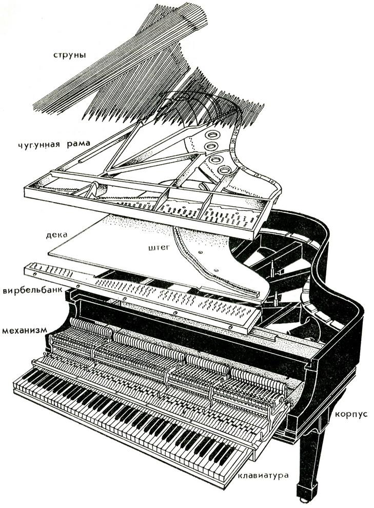 Задняя часть корпуса фортепиано не имеет специальных щитов. Футор с декой и задней доской предохраняют струнную одежду и механику от внешних воздействий и попадания пыли.