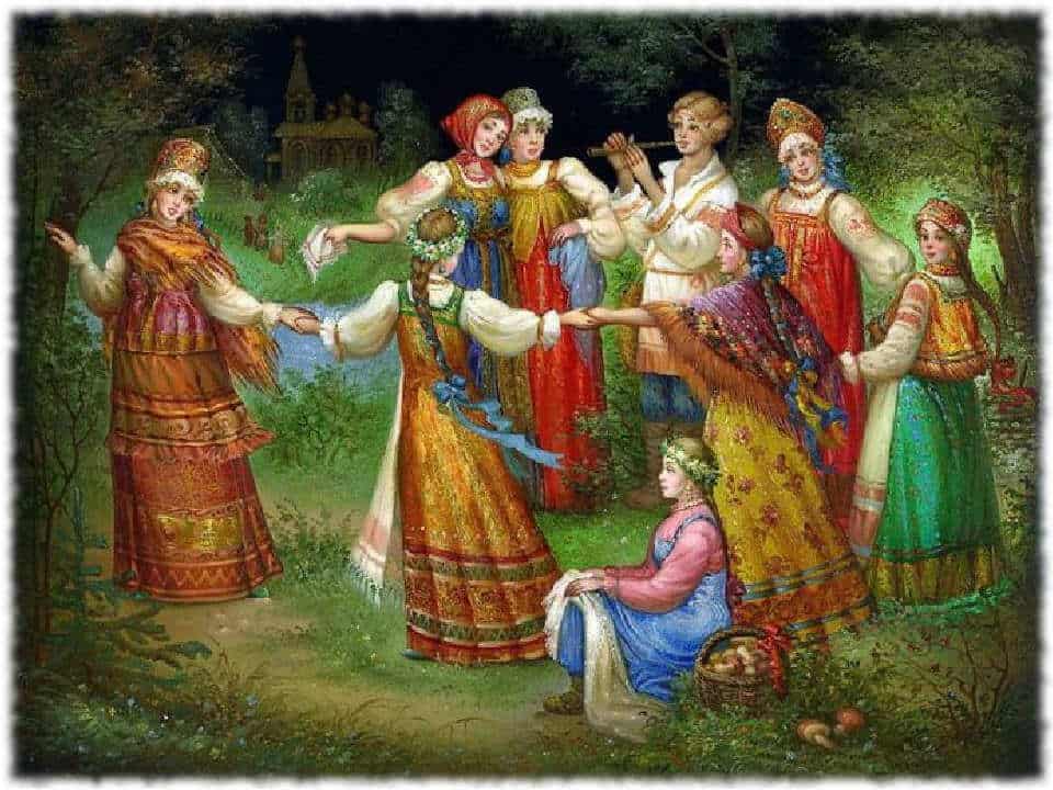 Сюда же можно отнести хороводы, ибо кроме социального (с целью познакомиться и найти будущую пару), хороводы несли сакральный смысл – призвать весну или лето. Хороводы – забава только для незамужних девиц, но бывало, что и молодухи (бездетные девушки, недавно вышедшие замуж) шли гулять и водить хоровод с подругами. Правда, только при условии, что им разрешал муж. Парни по большей части наблюдали за хороводами, девицы же их затаскивали и вовлекали в действо.
